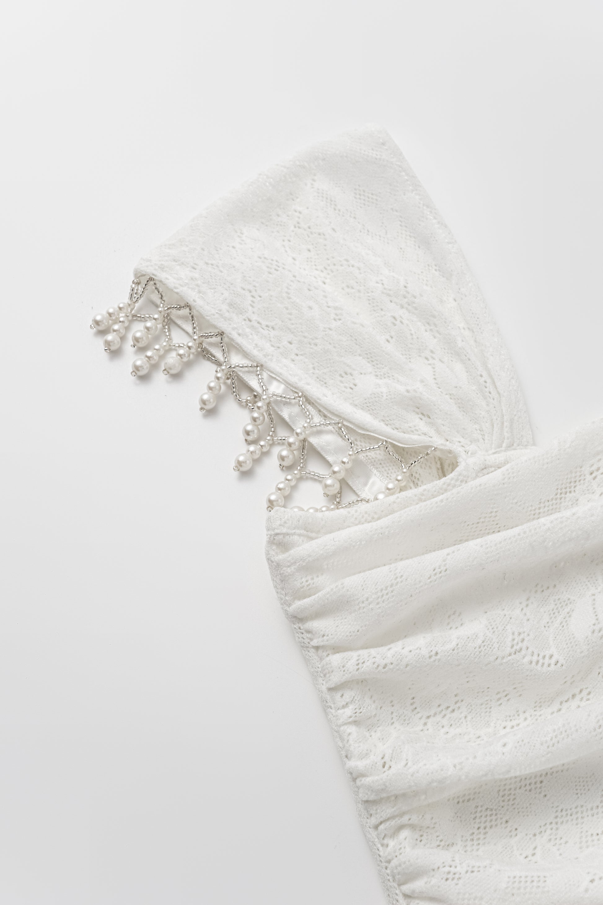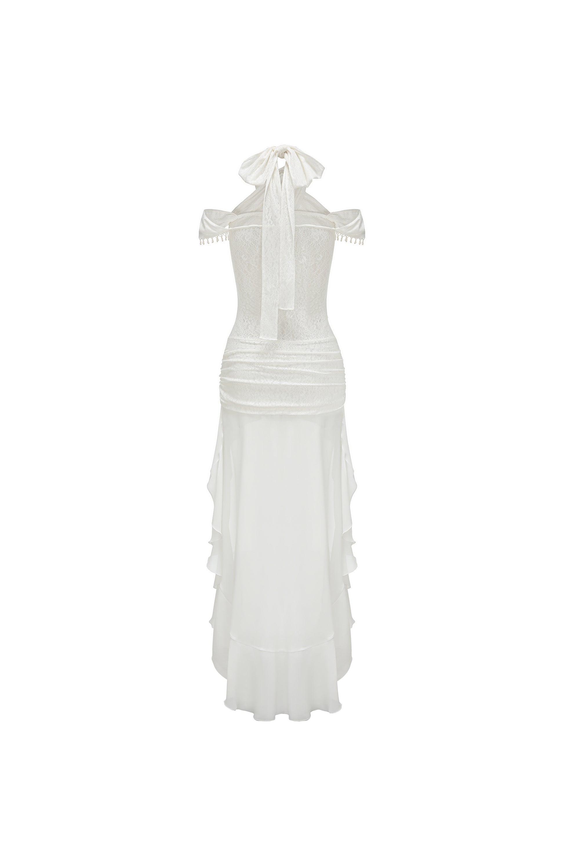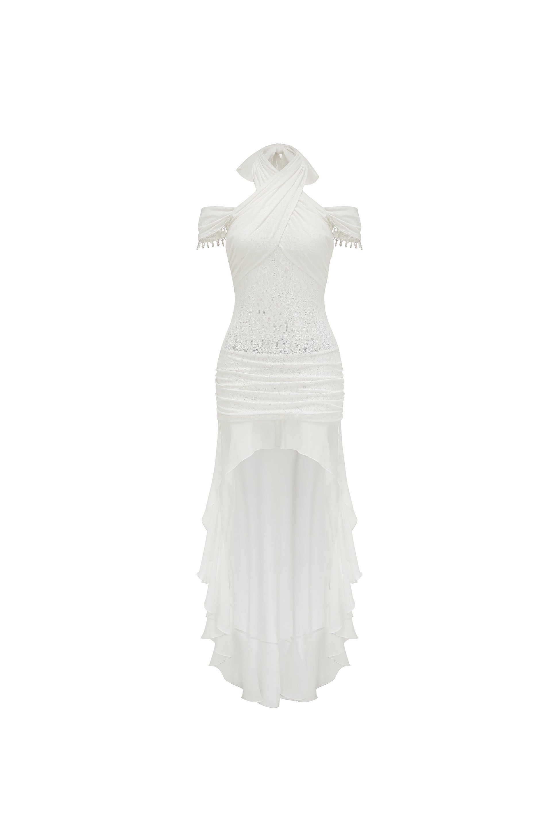 WHITE HALTER NECK LACE DRESS WITH TAIL