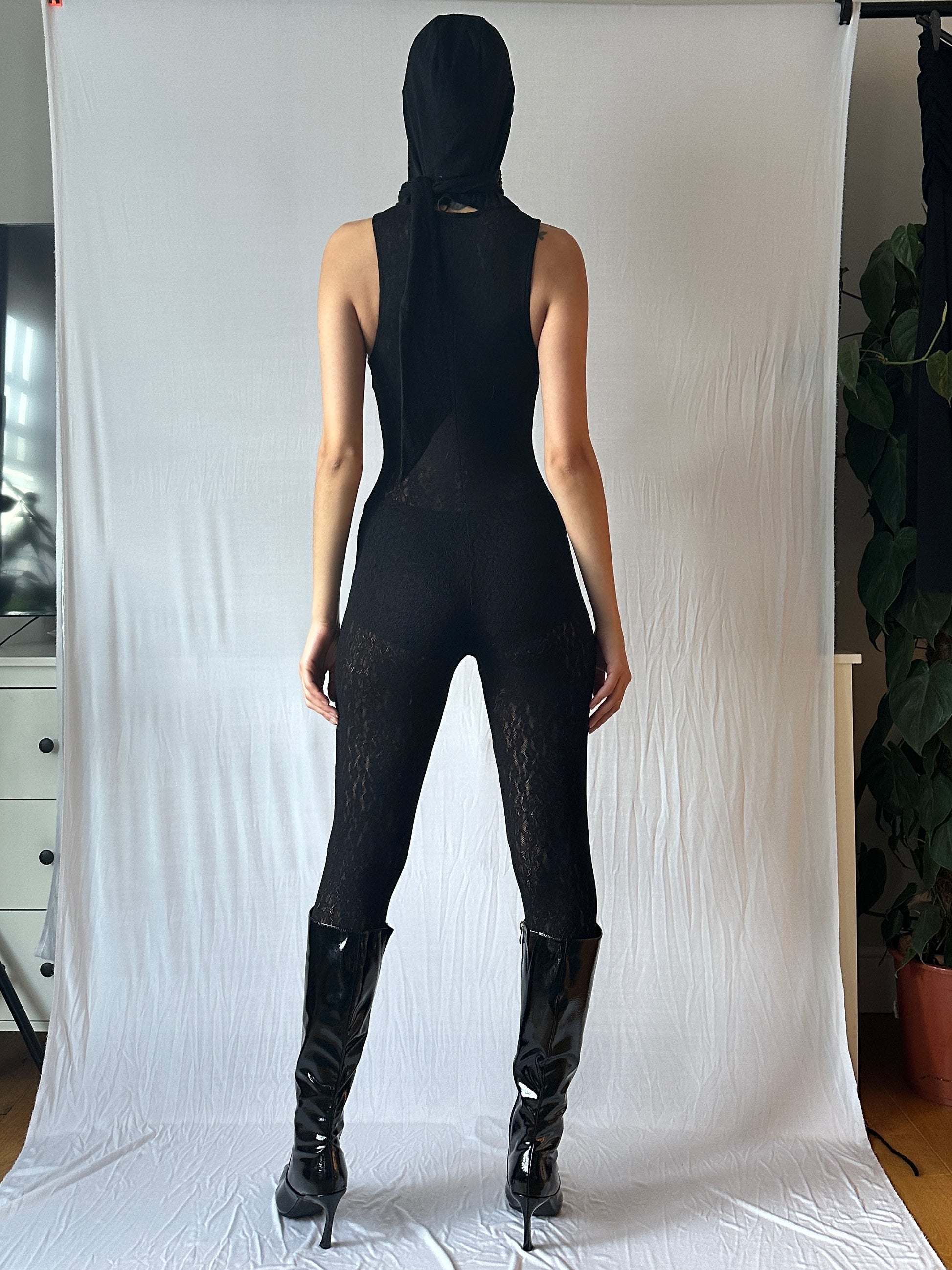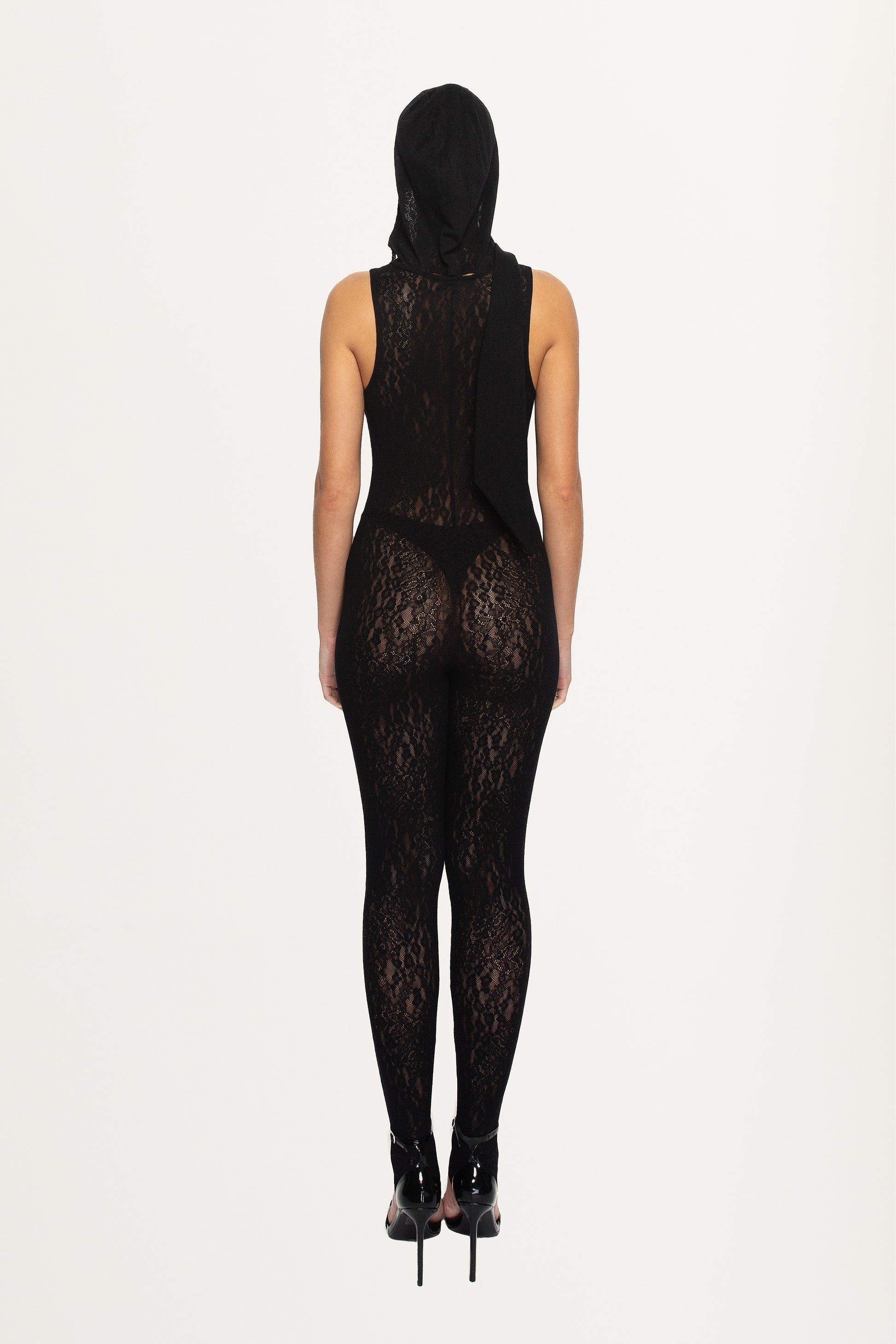 Elevate your style with this captivating Black Lace Jumpsuit with Pearls. Crafted from luxurious lace, it boasts a bodycon fit that accentuates your curves with sophistication. The addition of a hood adds a touch of modern flair, while the delicate pearls embellishing the ensemble create an exquisite and opulent aesthetic. Perfect for special occasions or nights out, this jumpsuit effortlessly combines elegance and edginess, making it a standout piece in your wardrobe. Flaunt your unique sense of style with this stunning lace jumpsuit and leave a lasting impression wherever you go.