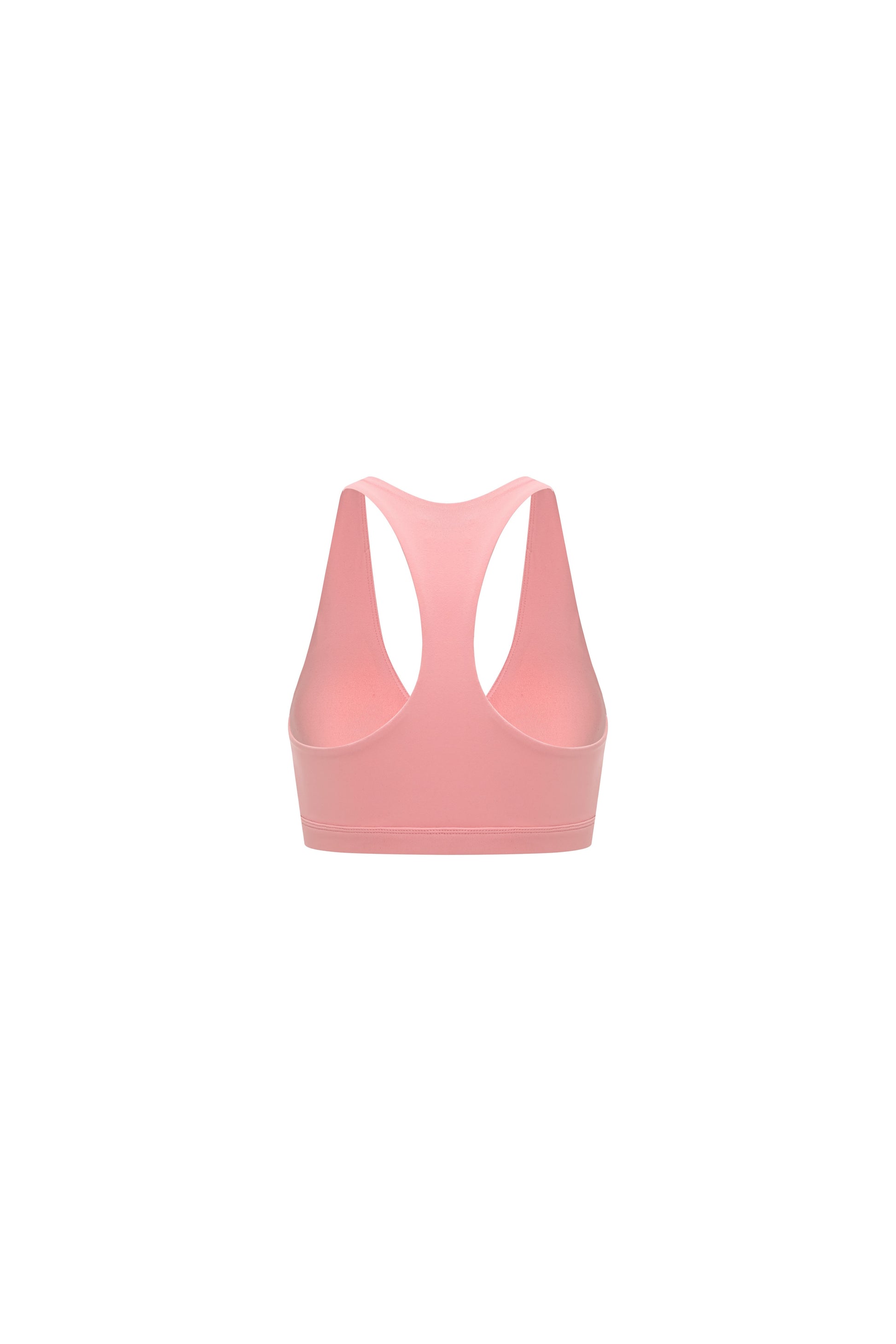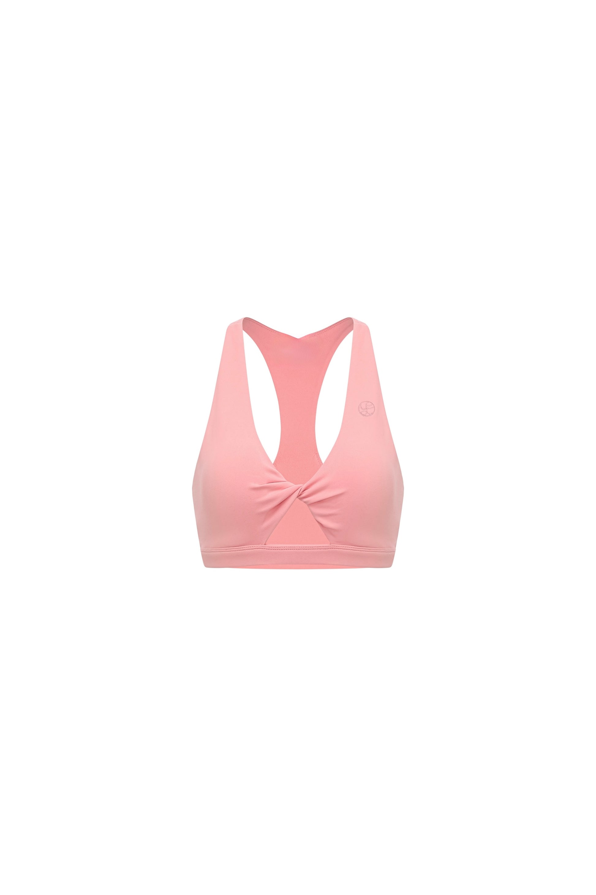 Meet your new go-to for feminine form and functional support. This blush pink sports bra features a sculpting fit with a signature twisted front and clean racerback cut, blending soft elegance with performance. Built-in removable padding shapes and supports, making it just as suited for movement as it is for mindful stillness. Crafted in breathable, sweat-wicking fabric, it flows with you — whether you're stepping onto the mat or stepping out for the day.